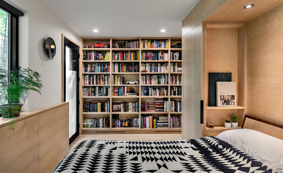 Programmatic spaces are carved out of the larger volume of this 1,000 sf accessory dwelling unit (ADU) by maple millwork, providing storage as well as definition to the different areas. The smaller volume of the house is partially embedded into a steep, wooded hillside and contains the private program including the bathroom, sleeping nook and bedroom. The larger volume houses the kitchen, dining and living room, as well as an office nook and an entry/mud/laundry area. A long window seat with pull-out side tables invites lounging and provides overflow seating. The light shelf, which caps the maple built-ins, is designed to support enough weight to serve as a whimsical lofted play area with ample room for plants.