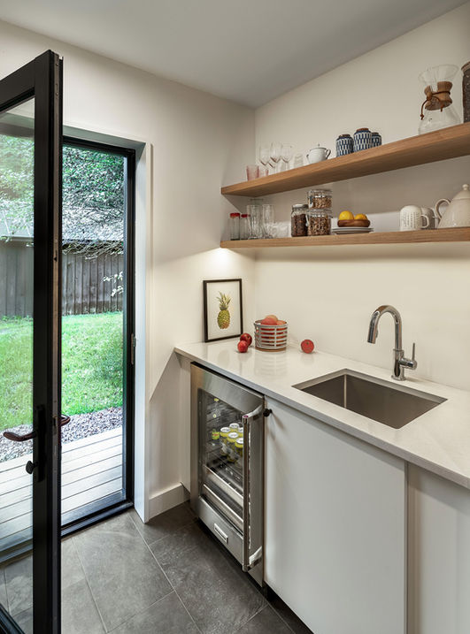 This new construction 400 sf outbuilding serves many purposes - a woodshed, a home office, a retreat for busy parents, a guest suite and a play space! Ample wood storage at the front of the building is sufficient for the main house as well as for the little Morso stove in the shed. Big corner windows in front of the desk provide a serene treehouse atmosphere for the workspace, and the kitchenette is stocked with coffee and tea, as well as after work beverages. Armchairs and a wood stove make for a comfortable retreat, and the guest suite is just a pull-down Murphy bed away, with a full bath tucked in behind the kitchenette. A library ladder allows access to all of the shelving as well as to a cozy loft space. This efficient building is fossil-fuel free, utilizing a heat pump for heating and cooling and the wood stove for supplemental heat and ambience.